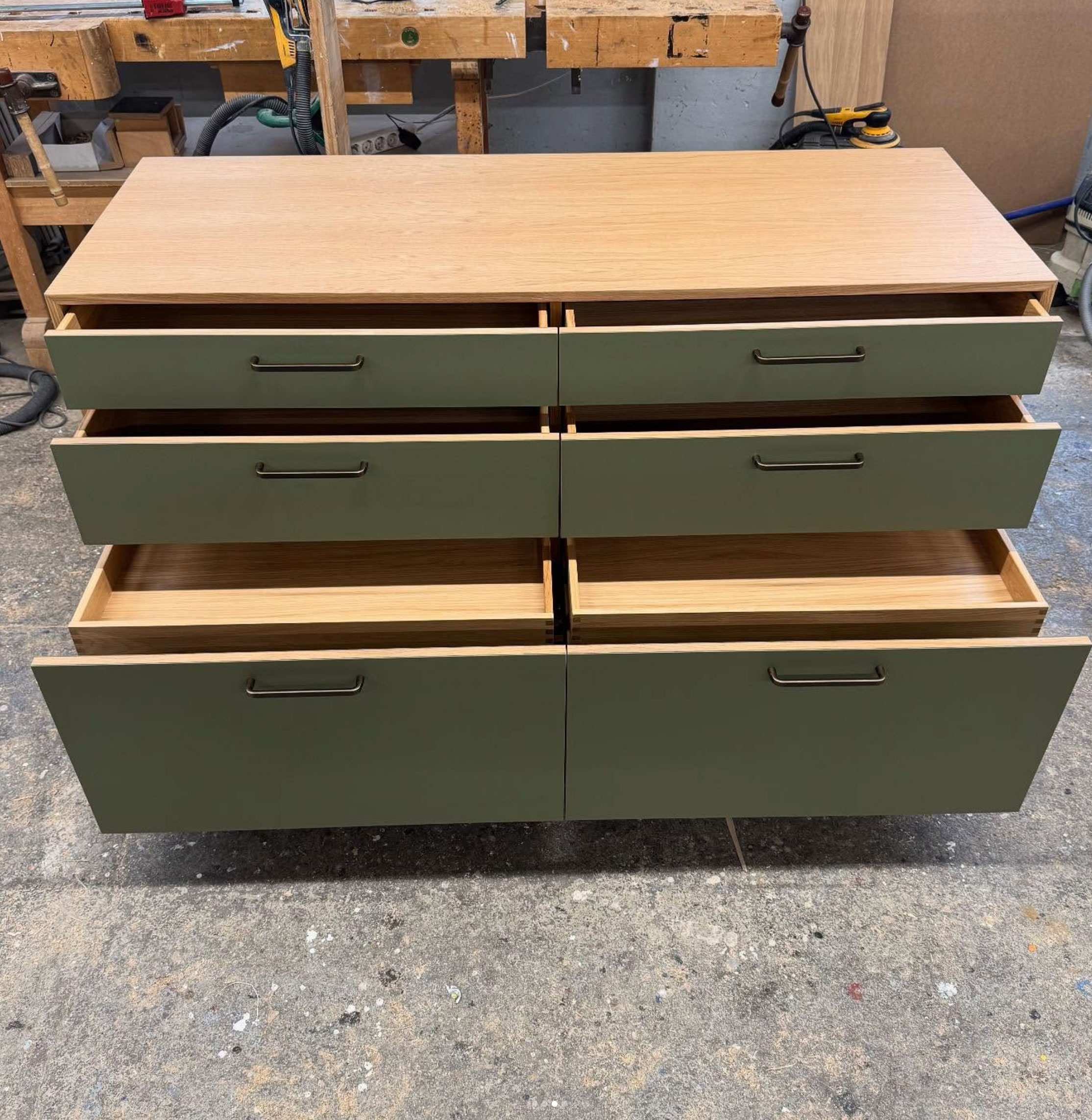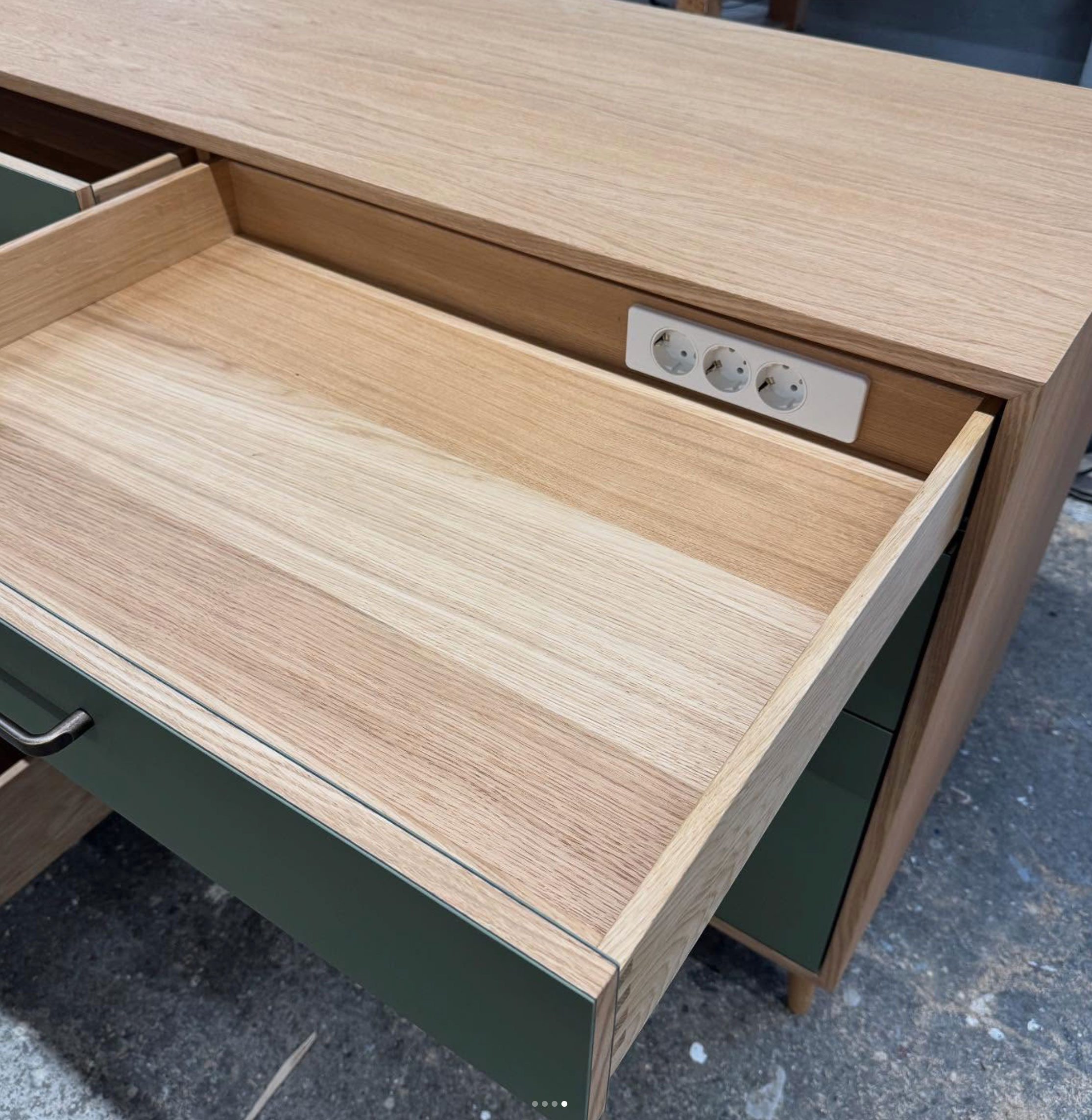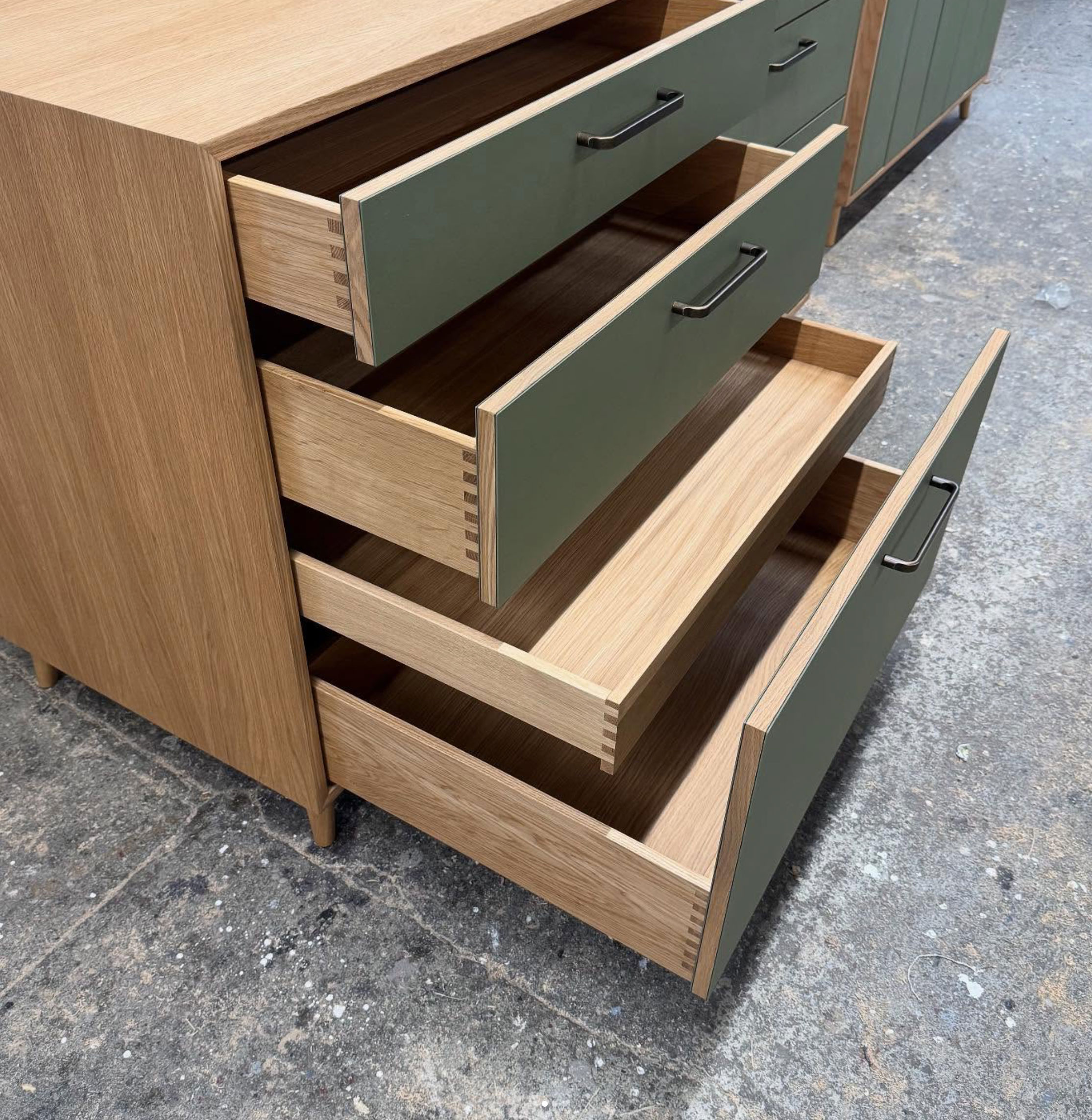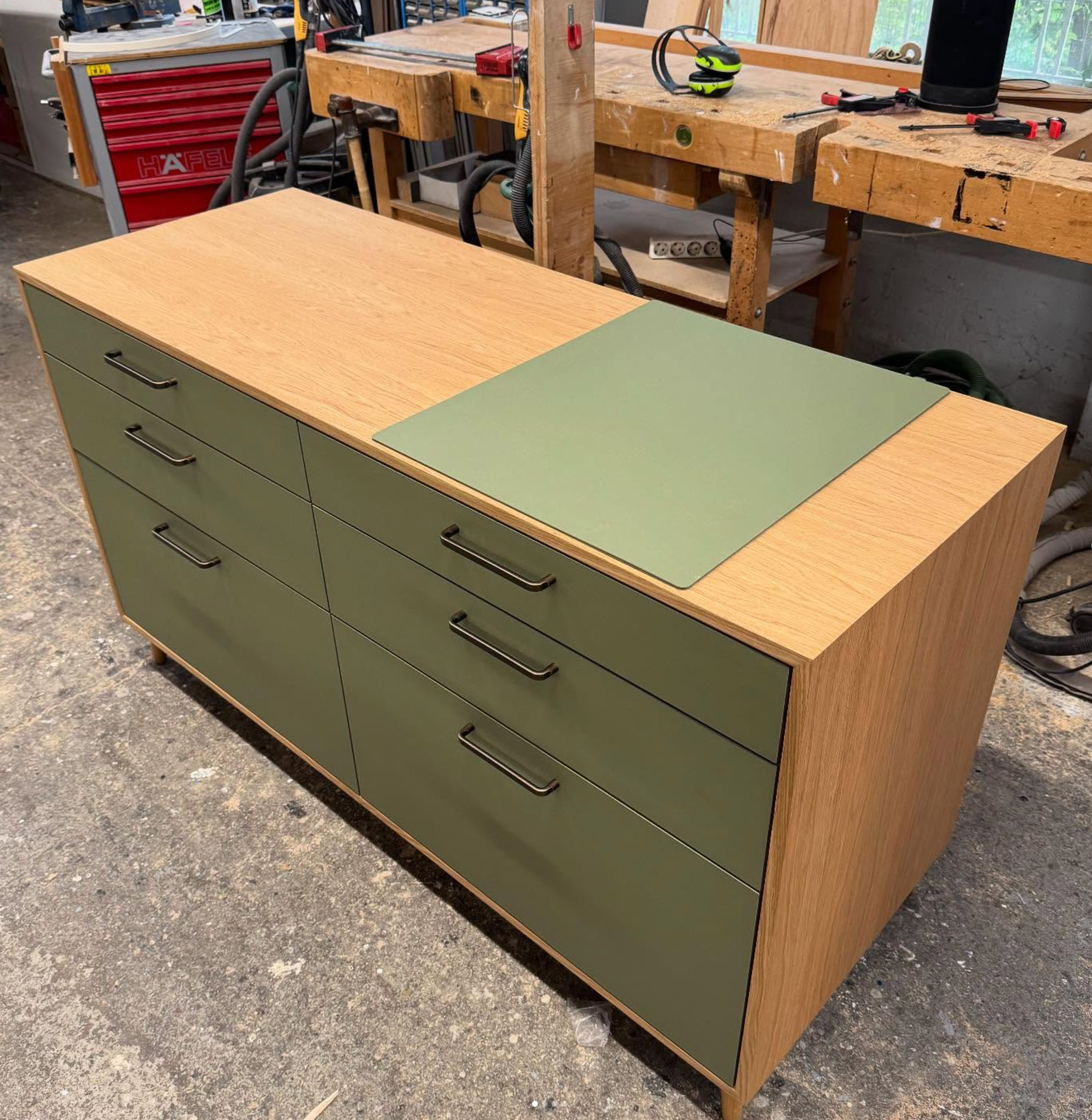 Sideboard für eine Espresso Maschine mit Eiche Korpus und Linoleum Fronten. Dazu passend: Geschirrschrank